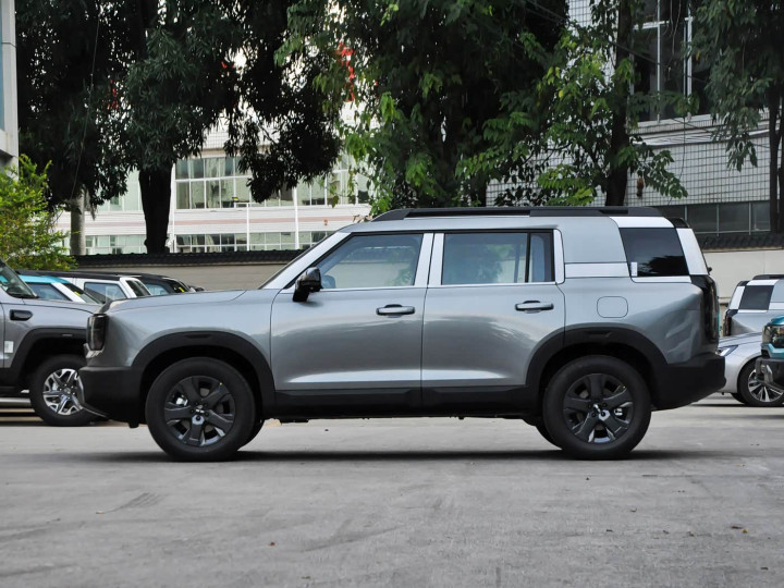 再来看车身侧面部分,车身侧面延续了经典的方盒子轮廓,但通过巧妙的设计细节实现了硬派与都市的完美平衡。4730mm的车长与2820mm的轴距,配合1910mm的宽体车身,营造出修长而稳重的视觉比例。隐藏式D柱设计形成的悬浮车顶效果,为方正的车身注入了一丝灵动,而立体腰线如同登山者的肌肉线条,从车头贯穿至尾灯,强化了力量感。原厂强身健体三大件成为点睛之笔:车顶平台不仅可承载自行车或大号行李箱,更集成四枚顶灯,夜间露营时能显著提升照明范围;军工级侧爬梯采用快拆设计,金属材质承重可靠且收纳便捷。