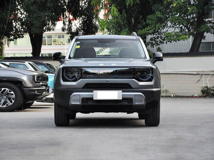 我们首先来看新车的外观设计方面,BJ30旅行家的车头设计完美诠释了硬派与精致的平衡美学。标志性的五孔进气格栅采用熏黑处理,内部镀铬饰条如琴弦般横向排布,既延续了北京越野家族基因,又通过透明灯壳设计赋予现代科技感。圆形LED大灯自带光环日行灯,夜间点亮时犹如猛兽瞳孔,配合环形灯带与格栅的融合设计,形成极具辨识度的前脸表情。前保险杠采用分层式结构,底部银色护板与黑色防擦饰板形成强烈对比,既强化了越野防护属性,又通过圆角过渡避免了线条的过度生硬。